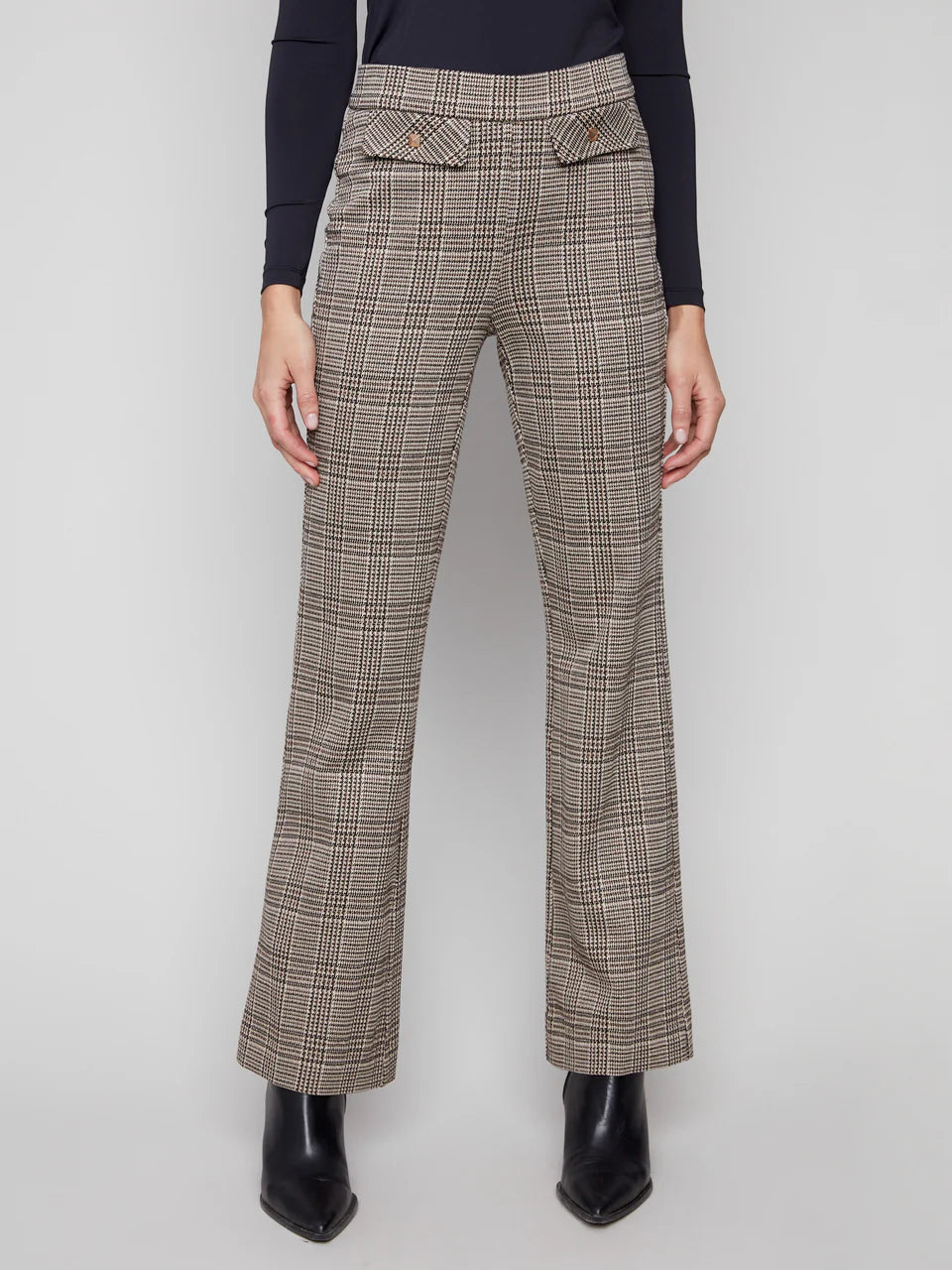Upgrade your fall-winter wardrobe with these chic Glen Plaid Flare Pants in brown tones. Crafted from luxurious fabric featuring a gold lurex thread, a classic plaid pattern, and faux studded flaps, they offer both comfort and style. Perfect for the office or an evening out, these pants make a sophisticated statement.