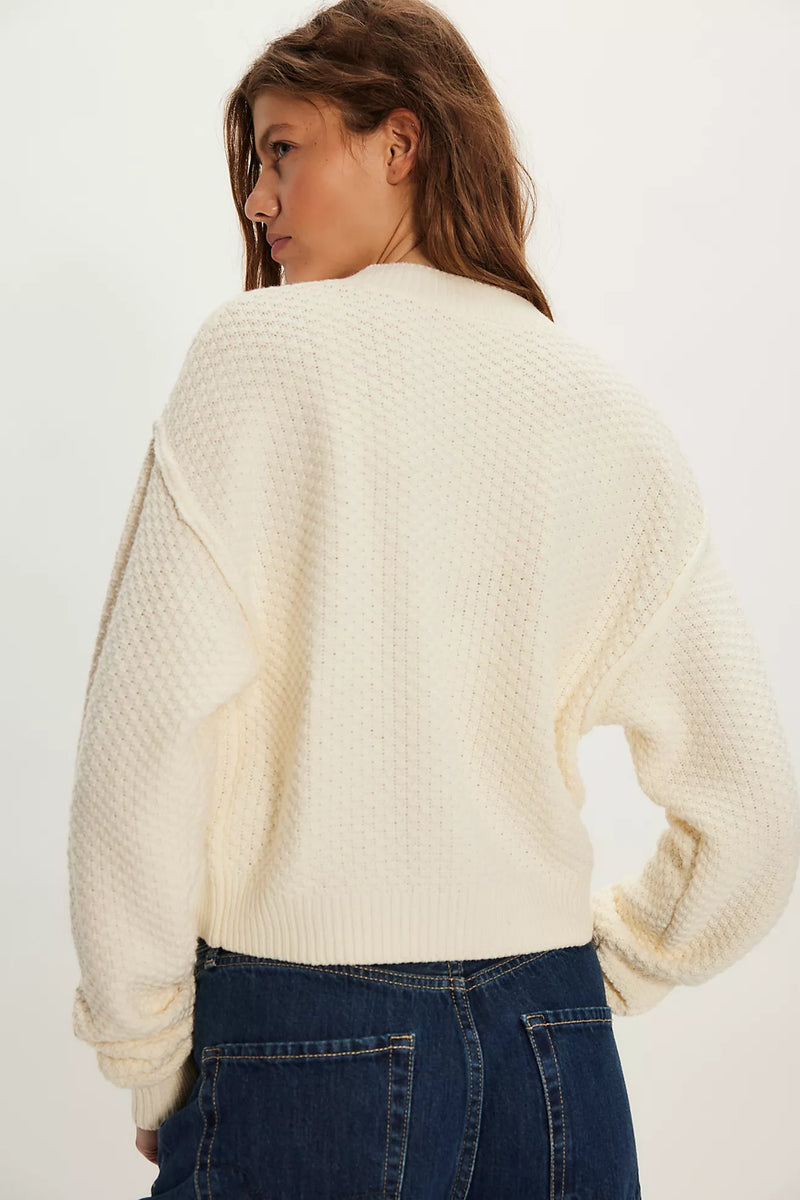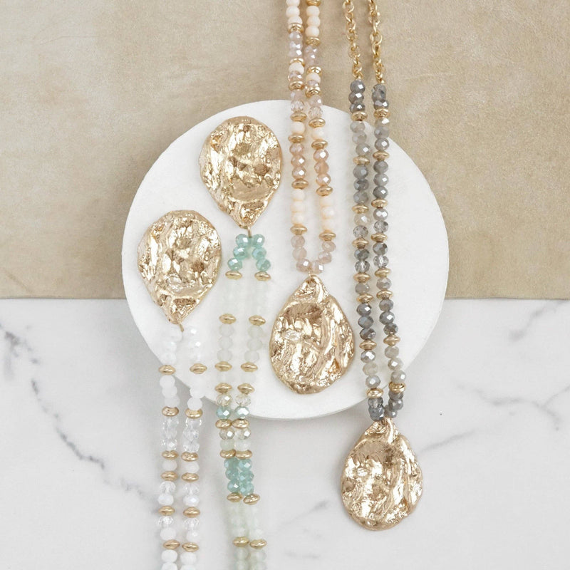 Long Beaded Necklace with Golden Teardrop Pendant - Whites