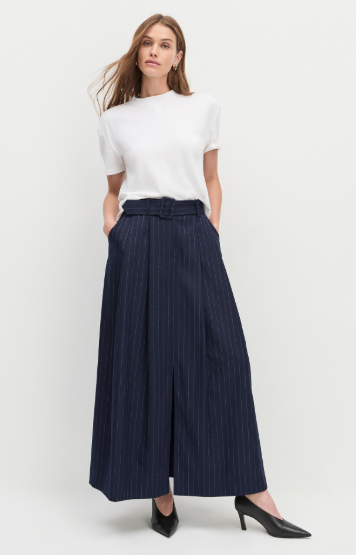 With timeless styling, The Gabby Skirt is your new pinstripe favorite. Made from a drapey woven blend, this belted high-waist, 37" full-length skirt keeps its shape. Front pleats, side pockets (!), and a front slit make it a year-round staple.
