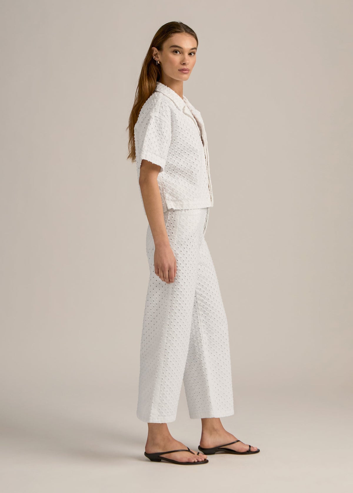 A denim shirt like no other. The Micha Shirt has a boxy fit with a drop collar, slit hem, and flap front pocket. Made from rigid white denim with frayed eyelet details, it’s perfectly undone in the best way. Pair it with The Masha Super High Rise Wide Leg Crop in Aspen wash for the full look.